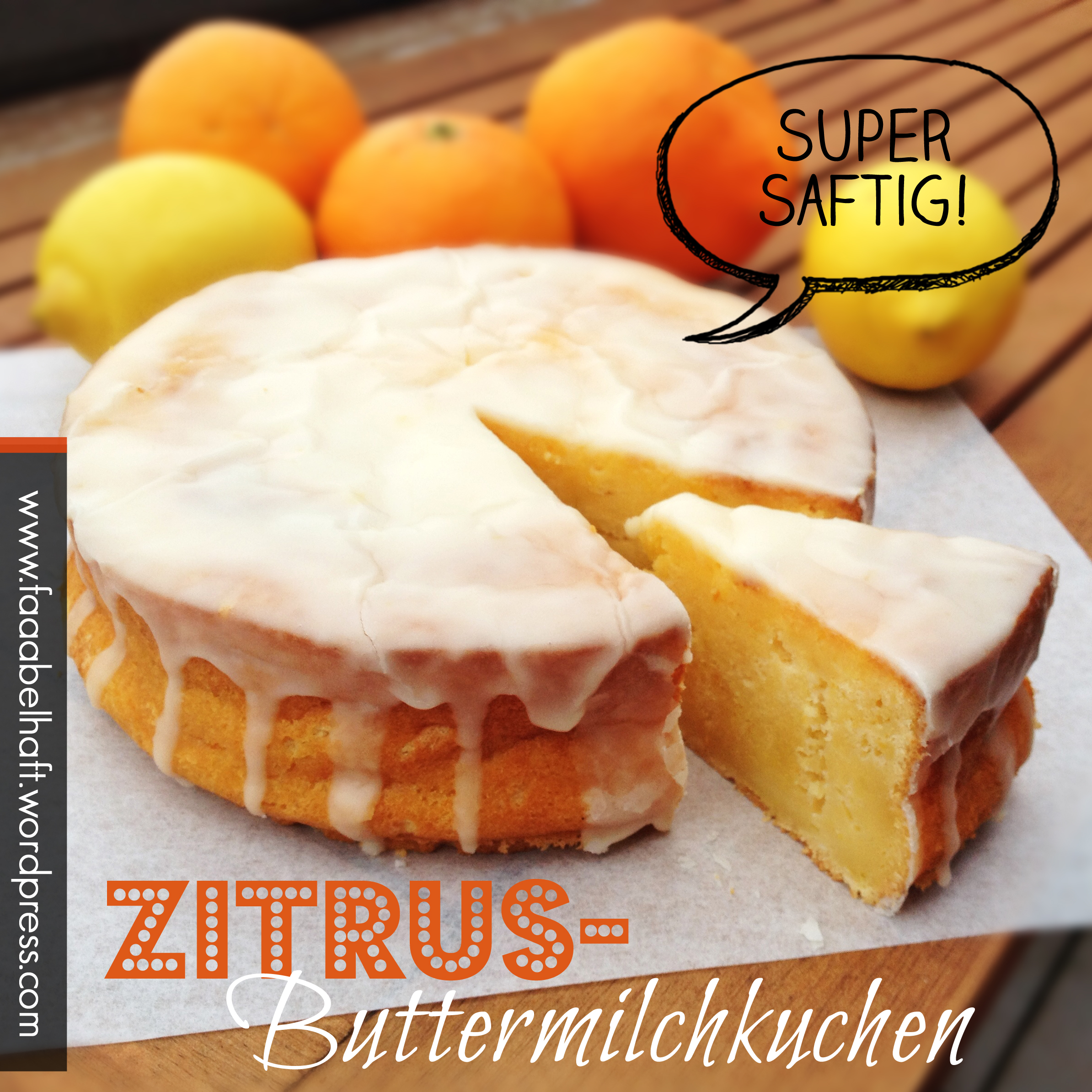 Aber wen stört es schon, wenn der Guss nicht ganz fest ist? Bei diesem supersaftigen, zitrus-orangigen Kuchen ist das ein Schönheitsfehler, der niemandem groß auffällt 🙂