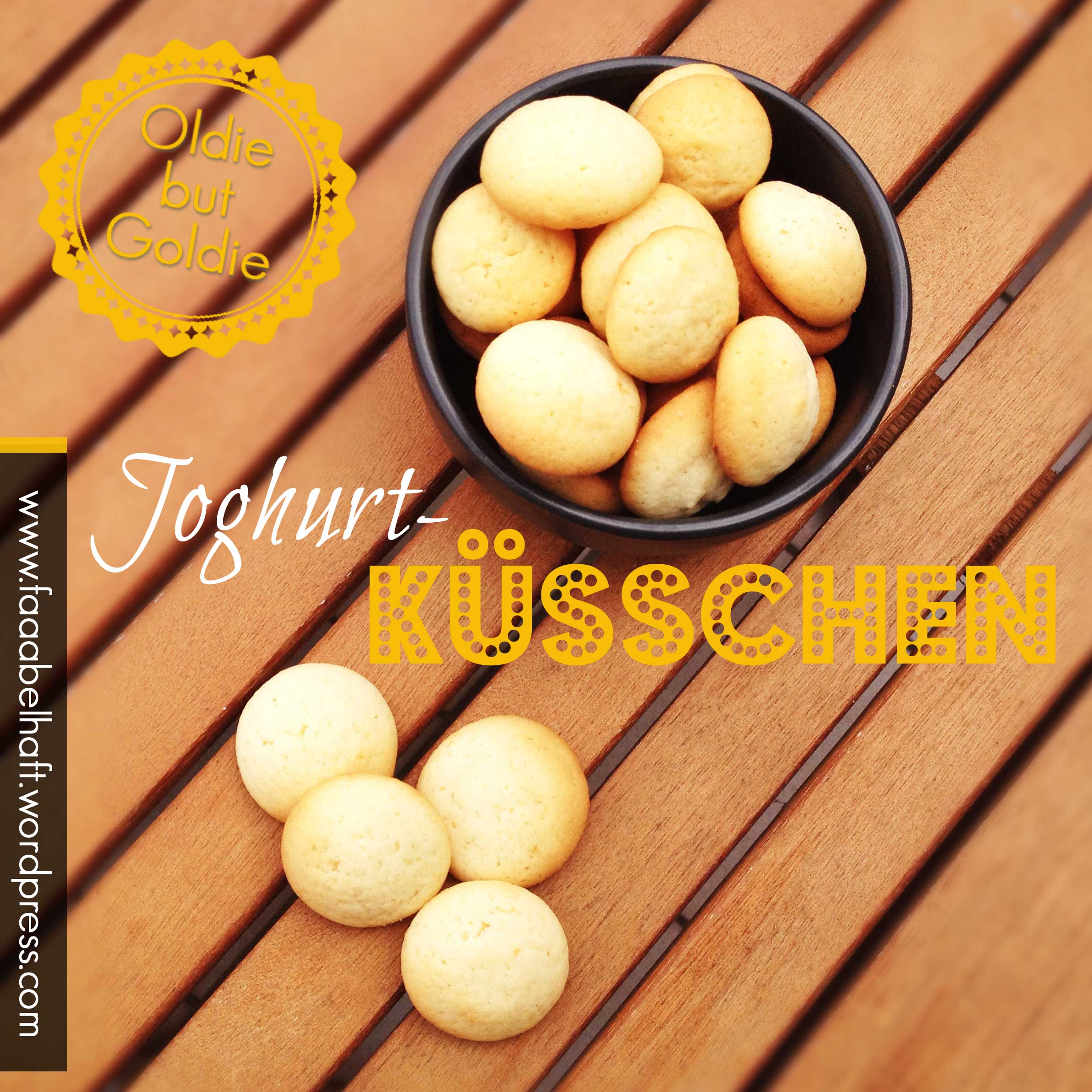 Die „Joghurt-Küsschen“ waren eigentlich mal „Joghurt-Gebäck“. Im Grunde sind sie irgendetwas zwischen Plätzchen und Keksen. Nicht so kross wie Kekse, aber auch nicht so weihnachtlich wie Plätzchen. Einfach irgendein Gebäck, das man das ganze Jahr über schnabulieren kann.