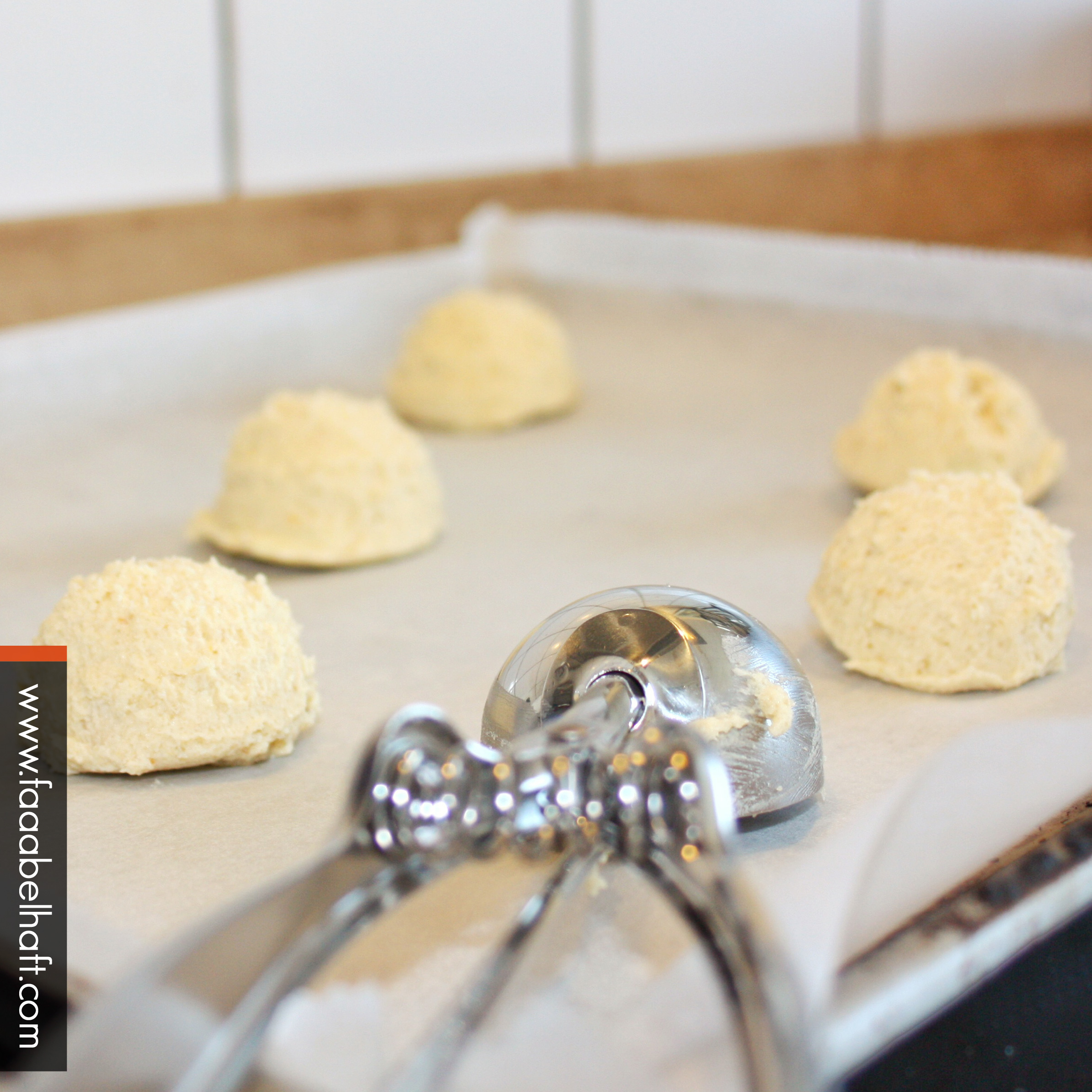 Den (ziemlich klebrigen) Teig mit dem Eisportionierer abnehmen und auf das Backblech setzen. Abstand halten! Die Cookies gehen ziemlich auseinander. Je nach Backblechgröße nicht mehr als 8 Portionen.
