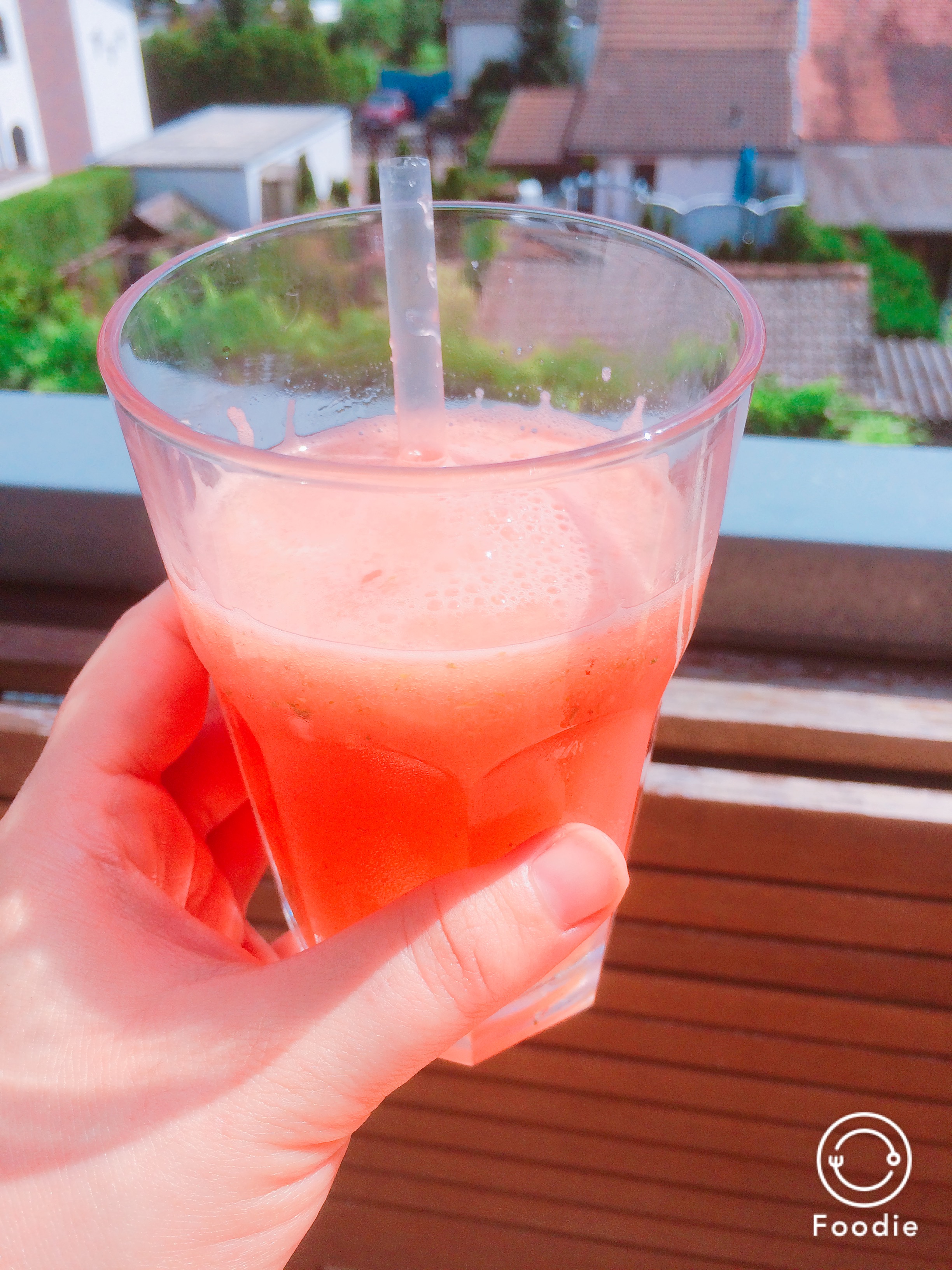 Also warum nicht mal „aromatisiertes Wasser“? Den Hype darum verstehe ich nicht ganz – meine Oma hat schon Obst in die Wasserkaraffe geschmissen, um es weniger langweilig schmecken zu lassen (gesund hin oder her). Das ist lecker, macht mich aber auch nicht immer ganz happy. Nach 3 Litern Wasser am Tag (im Sommer gern mehr) reißt mich auch die gepimpte Plörre irgendwann nicht mehr vom Hocker. Die nächste Idee: Smoothie (noch so ein Hype). Ist lecker, mir im Sommer aber gern mal zu „schwer“.