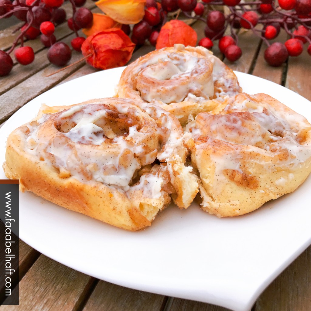 Der Frischkäse unterstreicht mit seinem etwas säuerlichen Geschmack noch das Aroma von Hefeteig und Bratäpfeln, also hier bloß nicht auf den normalen Puderzuckerguss zurückgreifen, sondern der Frischkäsevariante eine Chance geben.